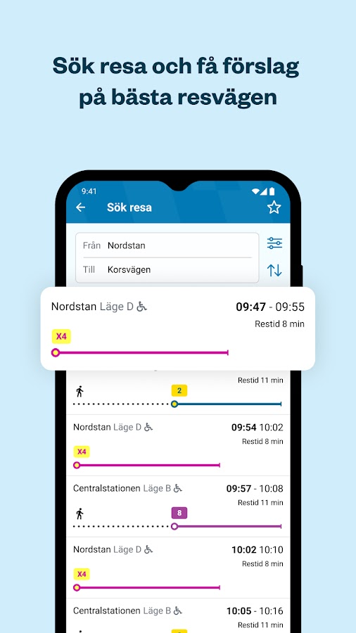 Привет! Вы пришли в нужное место. Это приложение Västtrafik. Здесь вы можете спланировать поездку, купить билет и получить актуальную информацию о дорожном движении. Вы можете путешествовать с приложением по Вестра-Гёталанду и Кунгсбаке.