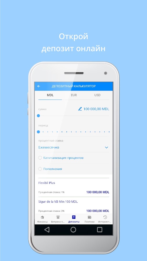 • Открытие онлайн-депозита в молдавских леях, евро и долларах США, пополнение и частичное снятие денежных средств — с сентября 2020 г.