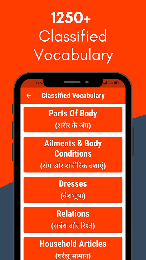 6. Более 1250 общих слов со значением на хинди. Помимо форм глаголов, это приложение также предлагает коллекцию из более чем 1250 общих слов со значениями на хинди, которые обогащают ваш словарный запас и дают практические лингвистические знания.