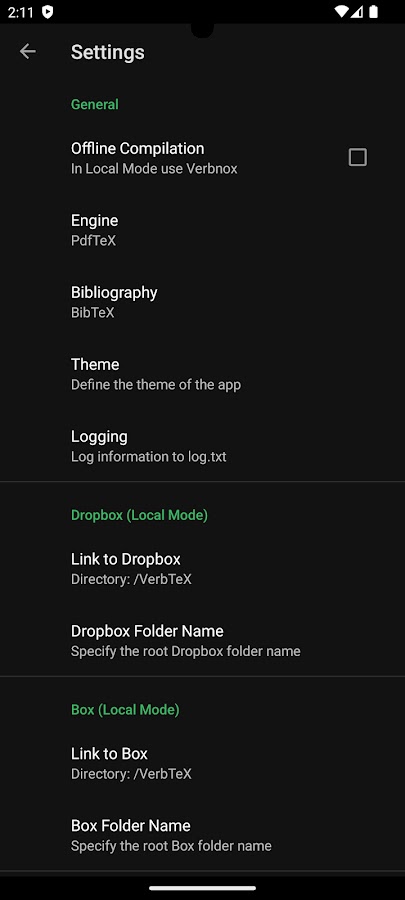 * Ссылка на Dropbox или Box (Настройки -> Ссылка на Dropbox / Ссылка на Box) и автоматическая синхронизация проектов VerbTeX