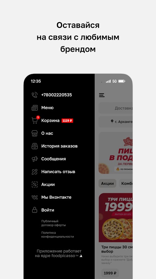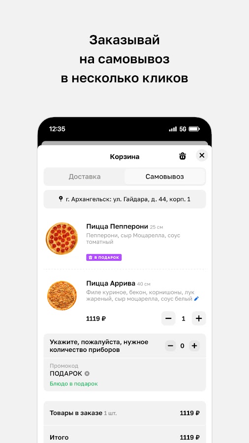 В меню доступны пицца, роллы, WOK, стрит-фуд, пироги, закуски, супы, салаты и завтраки. Выбирайте позиции с фото и описаниями и оформляйте заказ прямо со смартфона.