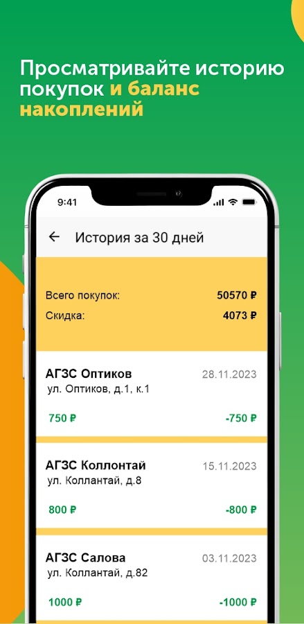 Отображение актуального баланса накоплений. Скидка по карте всегда растет! Вы всегда будете понимать, сколько покупок нужно совершить для перехода на повышенный уровень скидки в сети АГЗС.