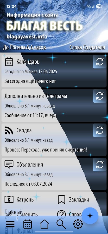 Раздел «Сводка» – лента новостей, сообщения из телеграм канала «Новости от Создателя», новости с сайтов «Доктрина» и «Академия».