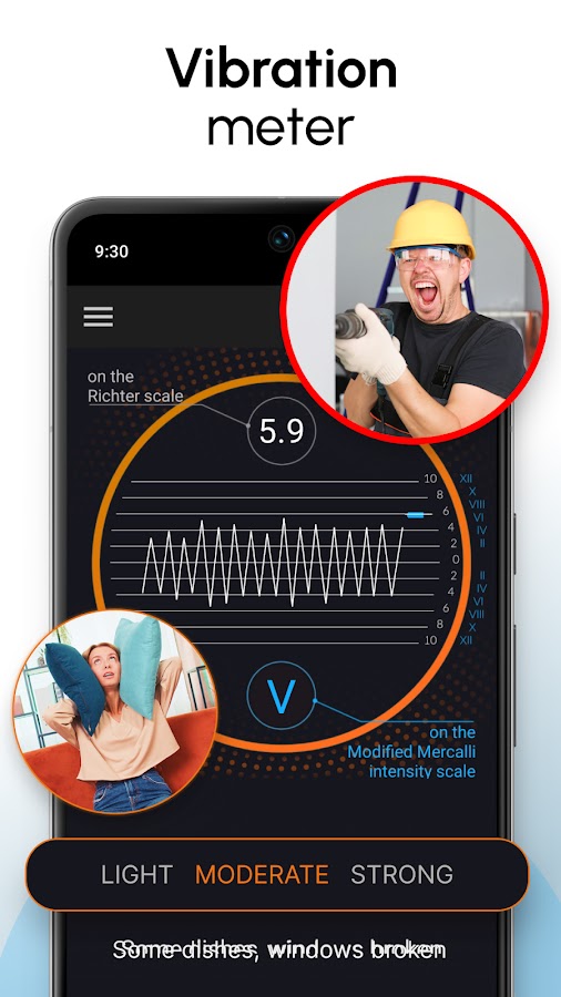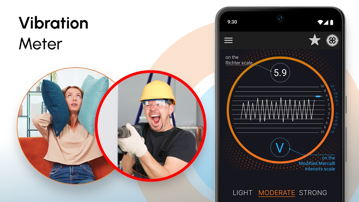 ★ Приложение содержит ссылку на вибрации землетрясений, классифицируемые по международной шкале интенсивности Меркалли для сейсмической активности, такой как землетрясения. Шкала интенсивности Меркалли — это сейсмическая шкала, используемая для измерения силы землетрясения. Он измеряет последствия землетрясения. Измеритель вибрации также может называться сейсмографом или сейсмометром, когда используется для измерения сейсмической активности.