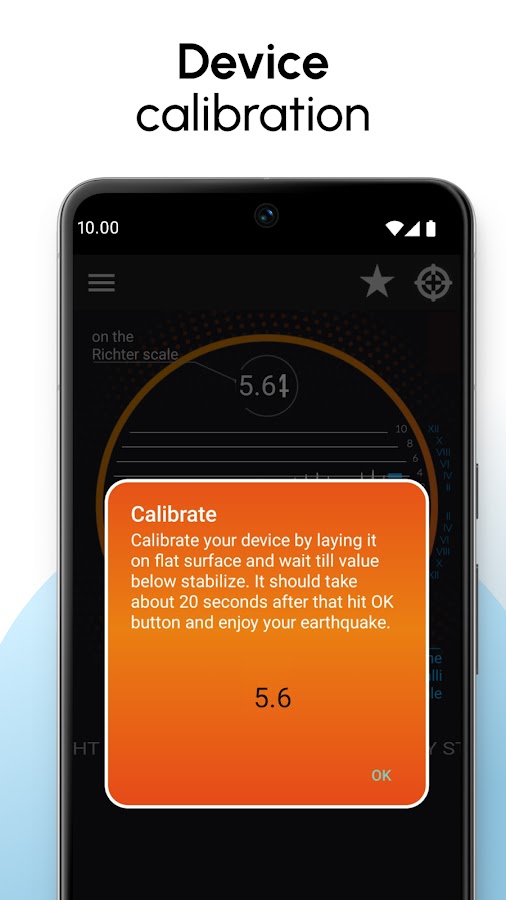 ★ Чтобы откалибровать приложение, нажмите кнопку «откалибровать», положите устройство на ровную поверхность и дождитесь стабилизации значения. Это должно занять около 20 секунд. После этого нажмите кнопку ОК и наслаждайтесь землетрясением!