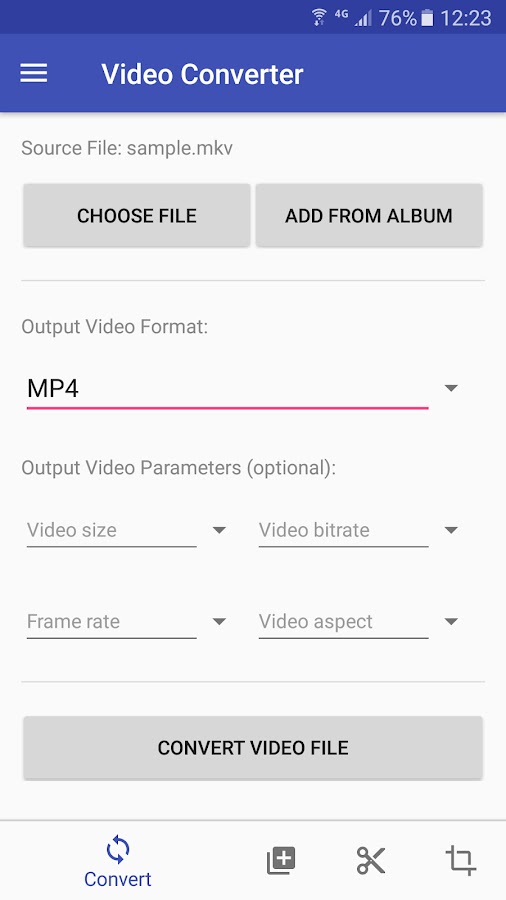 Video Converter выполняет три простых шага для завершения преобразования видео. Сначала выберите несколько видеофайлов или выберите папку, чтобы добавить в нее все видеофайлы, затем установите параметры и целевой формат видео, в который вы хотите преобразовать. Параметры целевого видео включают размер видео, битрейт, частоту кадров и формат видео. Наконец, нажмите кнопку «Конвертировать видеофайлы», чтобы начать преобразование. Преобразование может занять от нескольких минут до нескольких часов в зависимости от размера видеофайла и производительности процессора вашего телефона.