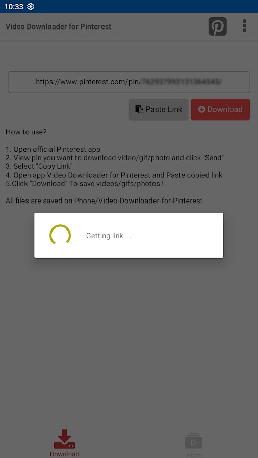 Шаг 5: — После копирования ссылки на видео из pinterest, вы вставляете ее в приложение «Загрузчик видео для Pinterest» и нажимаете кнопку загрузки.