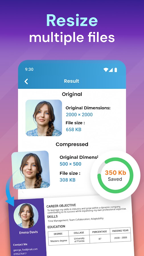 Редуктор размера видео и редуктор размера фото могут оптимизировать файлы, чтобы уменьшить размер файла, и вы можете уменьшить размер изображения в килобайтах с помощью приложения для сжатия изображений. Оптимизатор JPEG — одна из замечательных функций. Инструменты сжатия видео позволяют сжимать видео и изменять размер видео. В нашем приложении нет ограничений, вы можете сжимать видео и фото в КБ столько, сколько хотите за день.