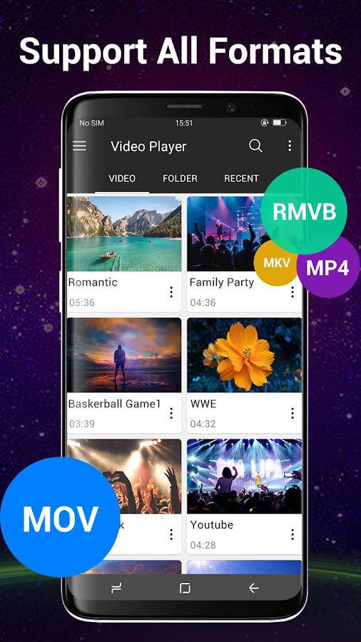 Video Player поддерживает все популярные видеоформаты, включая 3GP, AVI, FLV, M4V, MKV, MOV, MP4, WMV и т. Д.