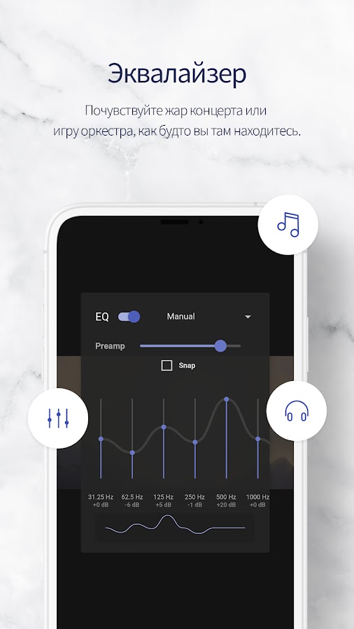 В приложении есть эквалайзер для более реалистичного воспроизведения.
