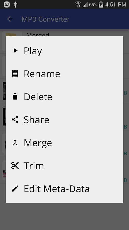 — Параметры (воспроизведение, удаление, переименование, совместное использование, редактирование метаданных, обрезка, слияние)