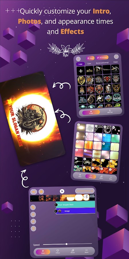 * Приложение постоянно обновляет новые шаблоны, музыку и стикеры, так что скачайте Intro Maker.