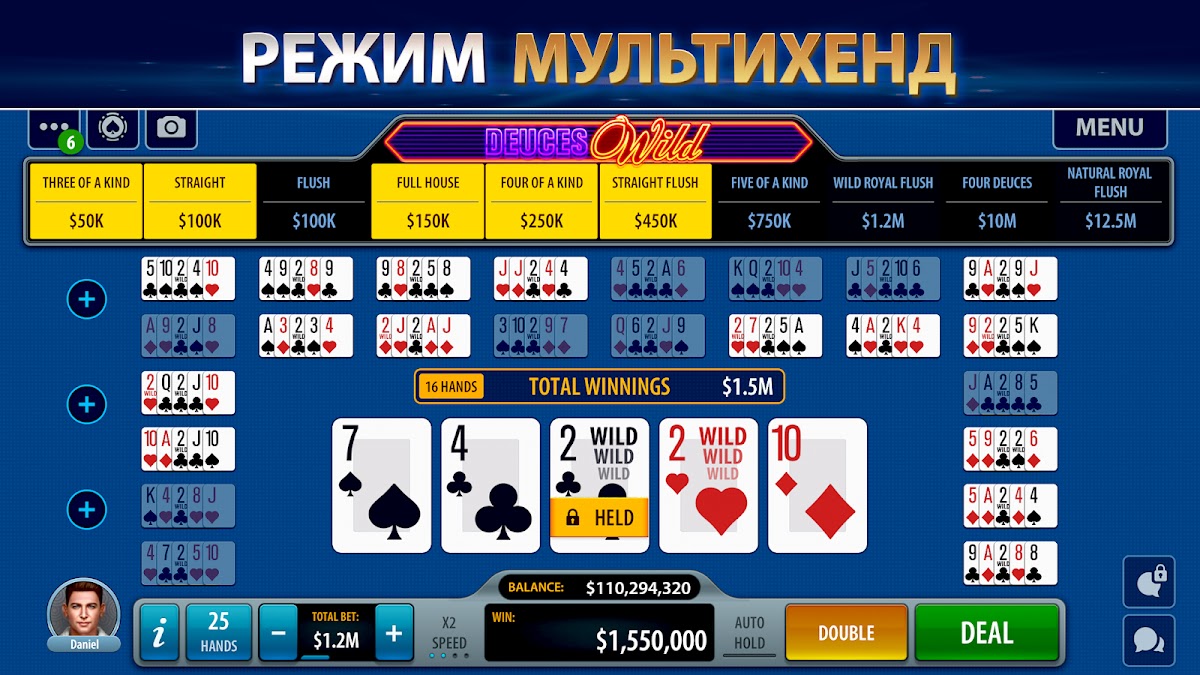 Выбирайте между классическими механиками и мультихенд-режимом, где вы можете сыграть до 25 раздач за раз!