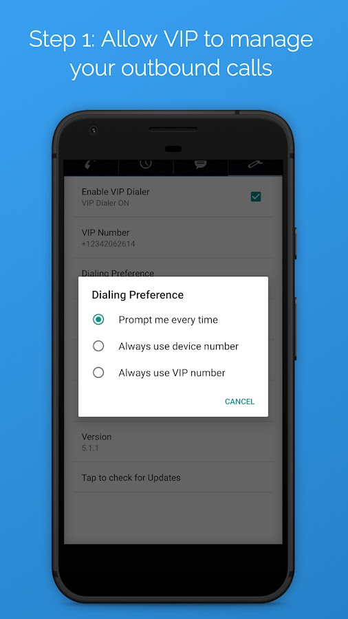 Основная функциональность VIP-приложения заключается в проксировании исходящих вызовов, сделанных с помощью встроенного дозвонщика вашего телефона. При наборе номера с клавиатуры или контактов вам будет предложено выбрать свой VIP-номер или номер устройства в качестве линии, используемой для исходящего вызова.