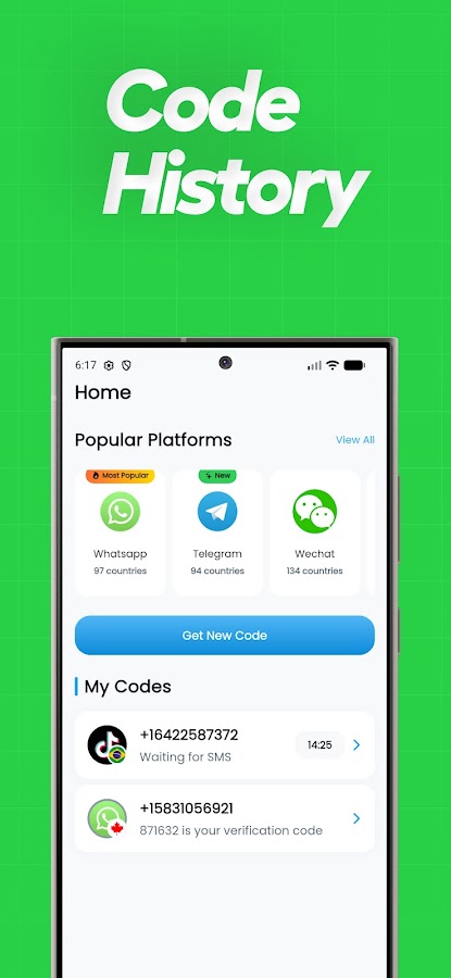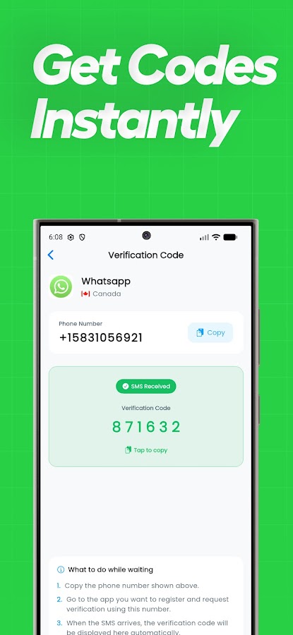 — Получите код: мгновенно получите код подтверждения через виртуальный номер и используйте его для создания учетной записи или верификации на таких платформах, как WhatsApp.