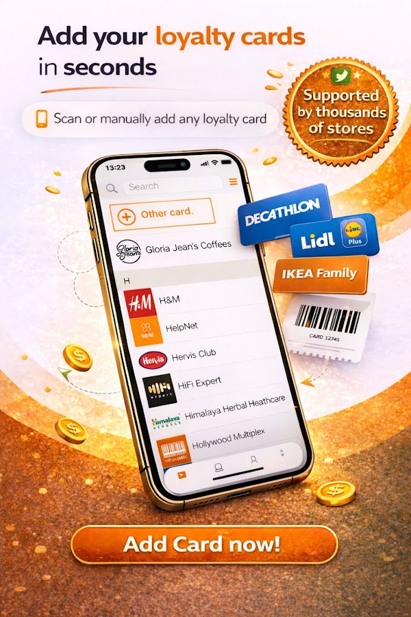 Все ваши карты лояльности в одном бесплатном цифровом кошельке. Забудьте о пластиковых картах — храните их на телефоне, упорядоченные и всегда под рукой.
