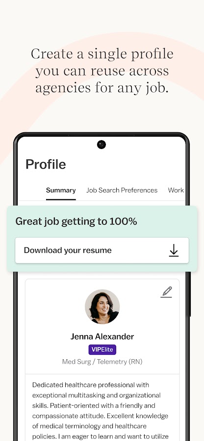 Создайте специализированный универсальный профиль, который вы можете использовать так же, как резюме / резюме в сфере здравоохранения, чтобы быстро и легко подать заявку работодателям в сфере здравоохранения по всей стране на работу в сфере здравоохранения, связанную с поездками, или на любой тип персонала, местный контракт или должности в сфере здравоохранения с суточными.