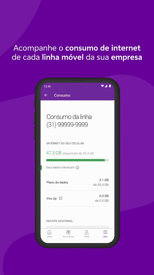 Если вы являетесь сотрудником компании, которая использует мобильные линии Vivo, вы можете отслеживать потребление вашей линии и, при необходимости, приобретать дополнительные интернет-пакеты для передачи данных и голосовые пакеты через приложение.