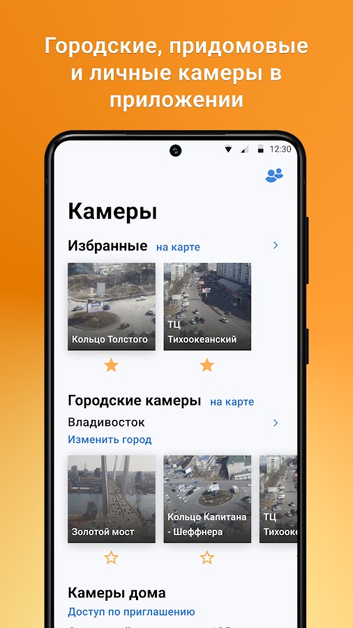 Просматривать городские, придомовые и личные камеры – добавляйте самые важные камеры в избранное, просматривайте видео в архиве до 7 дней (доступно скачивание архивной записи). Выдавайте доступ к просмотру ваших придомовых и личных камер тем, для кого это важно.