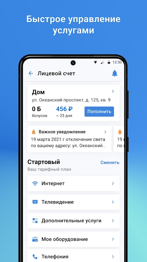 Управлять несколькими лицевыми счетами — добавьте счета родителей или близких людей для контроля и пополнения баланса, подключения услуг и своевременного получения информации.