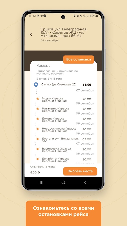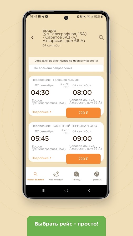 — Выбрать пункт отправления и прибытия, просмотреть актуальные автобусные рейсы и выбрать подходящий именно вам;