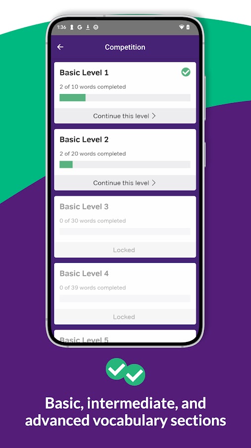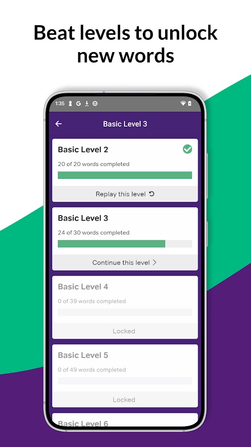 Каждый уровень, который вы избили, разблокирует более сложный: больше слов и более продвинутый словарный запас. Слова, которые вы не знаете, повторяются до тех пор, пока вы не освоите их, используя разнесенное повторение, которое было показано как очень эффективная стратегия запоминания.