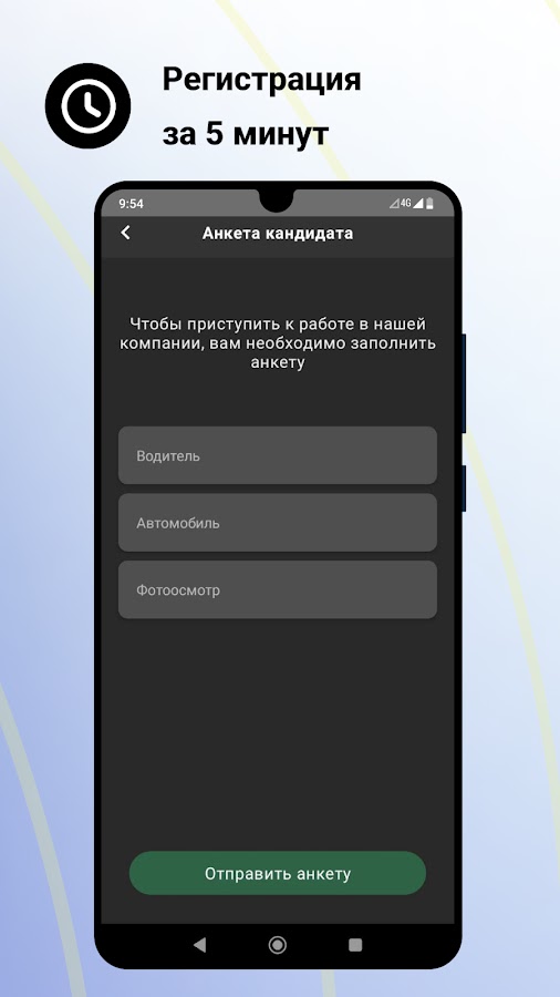 Заполните данные на экране, добавьте фото автомобиля, отправьте заявку и получите данные для авторизации — теперь вы можете приступать к заказам.