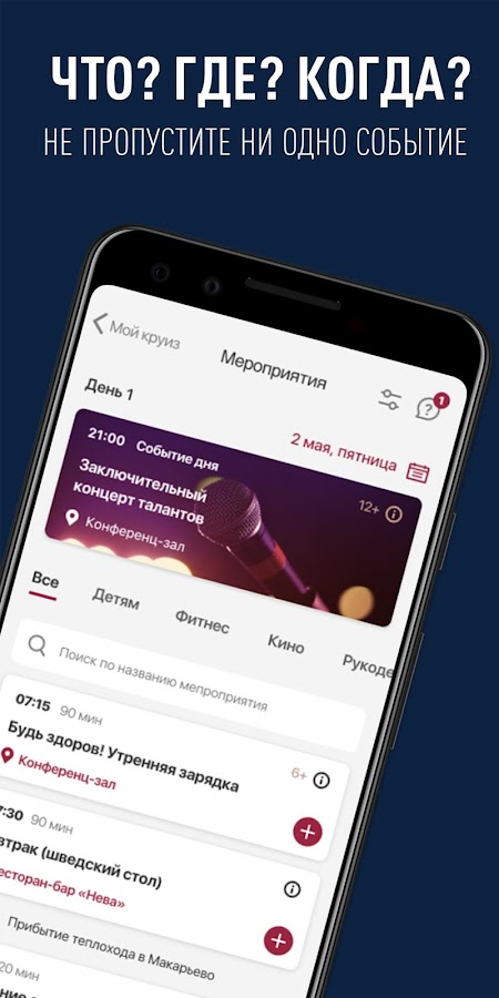 Мы знаем, как вам важно иметь все подробности своего путешествия под рукой. Здесь вы найдете программу дня с программой мероприятий: экскурсии, остановки, расписание ресторанов, главные ивенты на теплоходе. Вы можете добавить в свой персональный календарь мероприятия, которые планируете посетить.