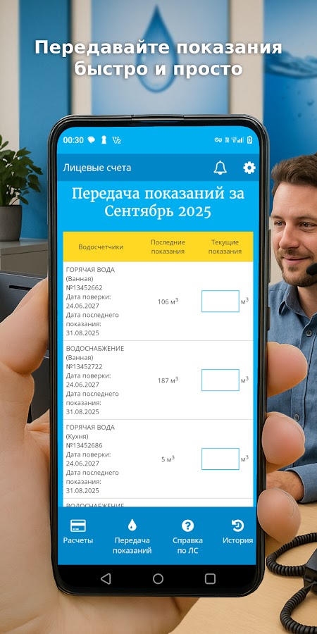 • Просматривать начисления за услуги водоснабжения и водоотведения;