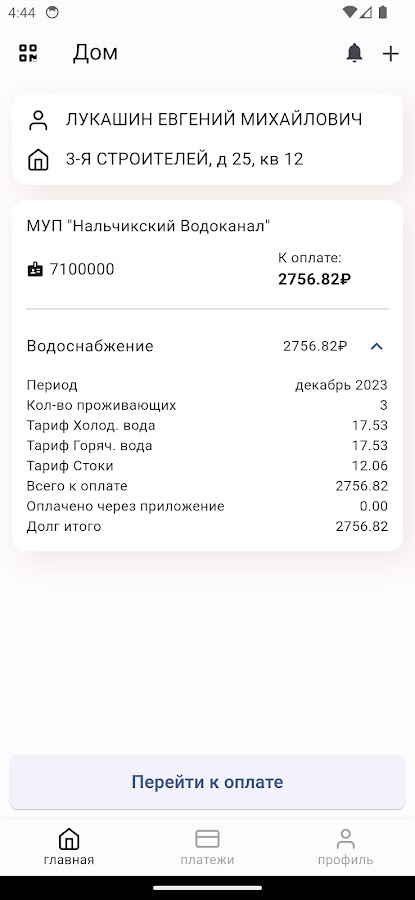 Мобильное приложение МУП «Нальчикский водоканал» – это сервис, который позволяет получать самые актуальные данные по задолженностям за водоснабжение и водоотведение, вести полный контроль над состоянием своего лицевого счета.