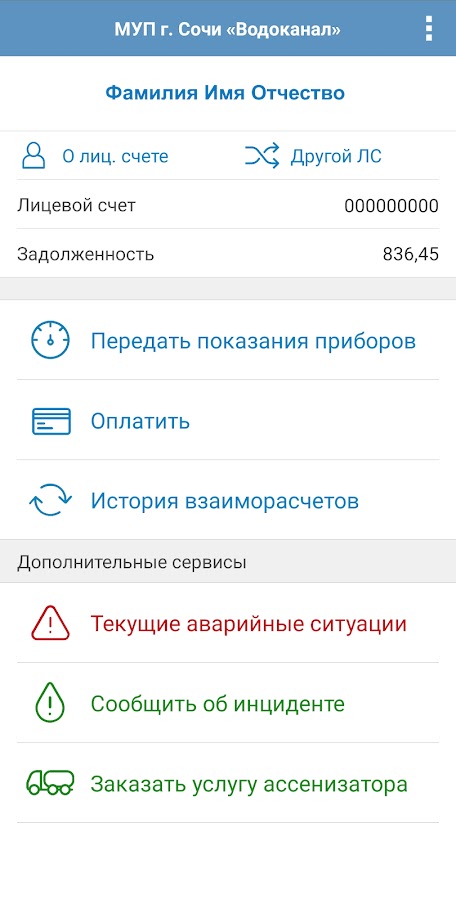 Личный кабинет абонента Муниципального унитарного предприятия города Сочи «Водоканал» позволит Вам получить информацию о лицевом счете, задолженности и переплате, просмотреть историю взаиморасчетов, ПЕРЕДАТЬ ПОКАЗАНИЯ приборов учета, оплатить услуги, сообщить об инциденте.