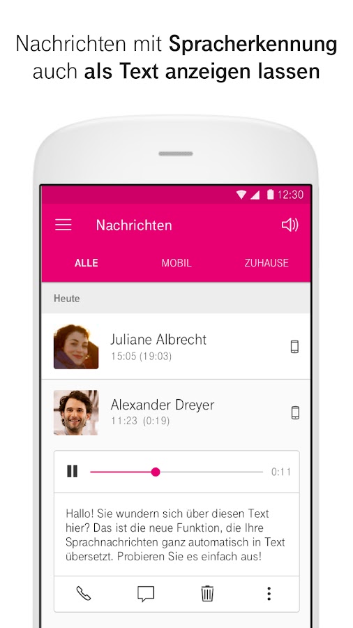 Пользуетесь ли вы автоответчиком в сети Telekom на ходу и дома? С приложением голосовой почты вам больше не нужно звонить на мобильный ящик и ящик голосовой почты. Голосовые сообщения четко отображаются на вашем смартфоне и планшете и могут быть прослушаны в любом порядке.