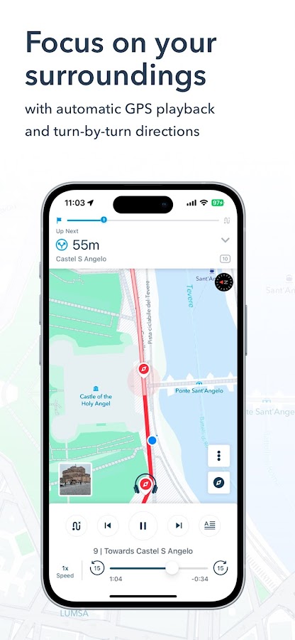 • Наслаждайтесь турами столько раз, сколько захотите, как в пункте назначения, так и дома. Виртуальное воспроизведение превращает каждый тур в подкаст или аудиокнигу.