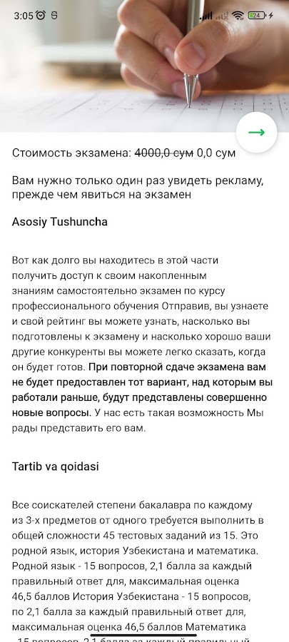 Ushbu ilovada barcha fanlar bo‘yicha barcha testlarga javoblar mavjud bo‘lib, foydalanuvchi savollarni yechigach, javoblarni tahlil qilib, o‘zi tanlagan universitetda onlayn imtihon topshirishi mumkin. Ilova onlayn ishlaydi.