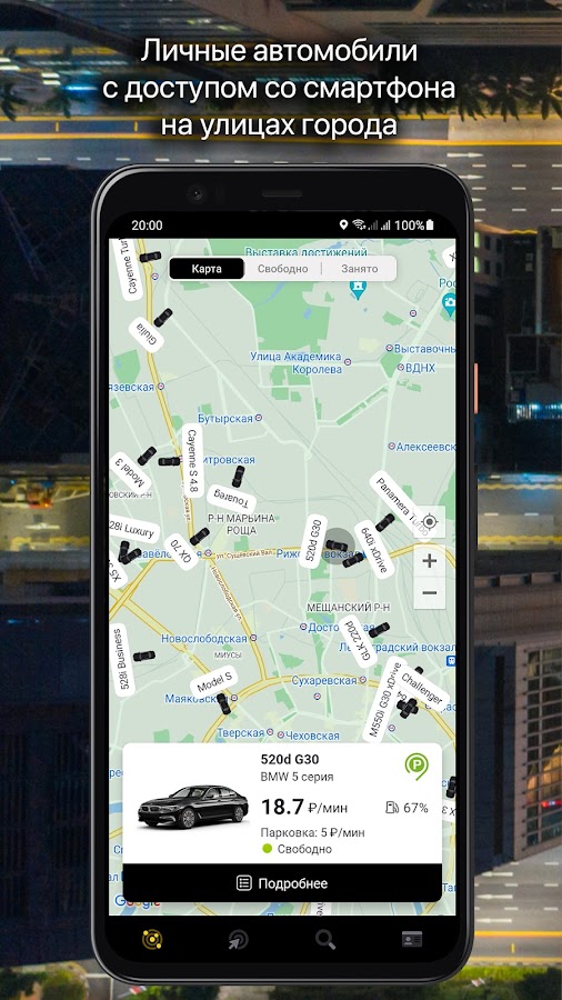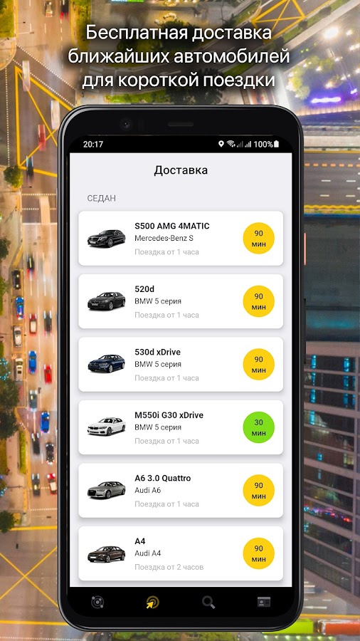 Вы можете найти ближайший автомобиль на карте, забронировать и взять его прямо с приложения, а после поездки оставить в любом разрешенном месте. Или заказать срочную бесплатную доставку и через 30-90 минут автомобиль будет перемещен в выбранную точку.