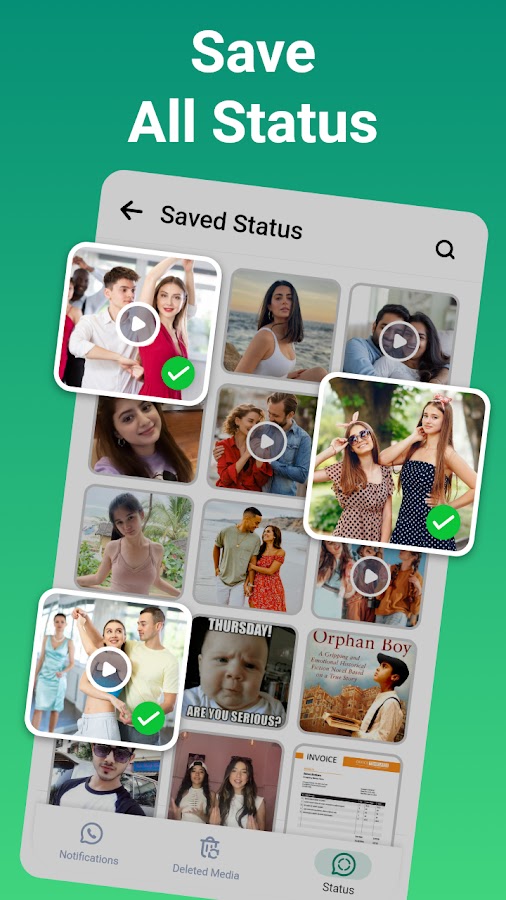 Вы также можете сохранить статус своих друзей в приложении для восстановления сообщений. Это ваше универсальное решение, позволяющее легко восстановить удаленные сообщения и сохранять видеостатусы и фотографии, не беспокоя друзей об обновлениях статуса. Просмотрите желаемый статус, сохраните его в своей галерее или разместите его где угодно с помощью этой заставки статуса. Приложение для загрузки статуса представляет собой полный пакет для вашего бизнеса в Австралии и Австралии.