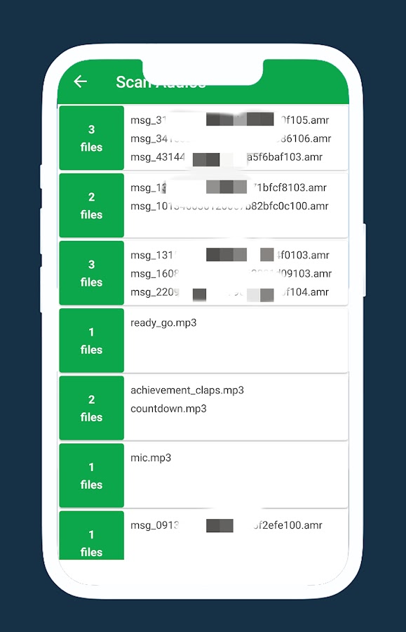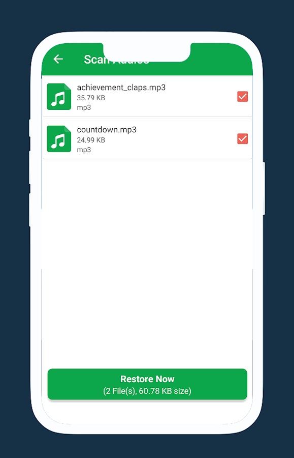 Это пользовательское удаленное приложение для восстановления звука. Приложение восстановления данных очень проста в использовании. Просто откройте приложение, сканировать удаленные аудио, и это может помочь вам найти и восстановить удаленные аудио. Всего несколько кликов, все удаленные аудио вы seleted будут восстановлены на ваш телефон.