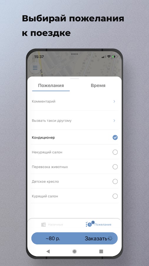Добавьте к заказу дополнительные пожелания. Например, когда на улице +35 — выберите «кондиционер». Если вы не переносите запах табака — укажите «Некурящий салон», и к вам приедет некурящий водитель.
