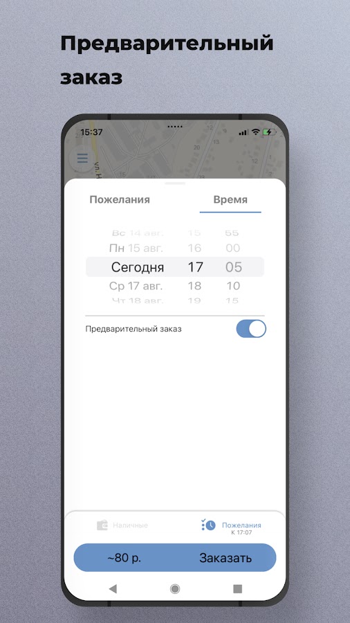 Выберите опцию “Предварительный заказ”. Поиск автомобиля начнется незадолго до заказа поездки, и автомобиль приедет к назначенному времени. Также вы будете заранее знать стоимость поездки.