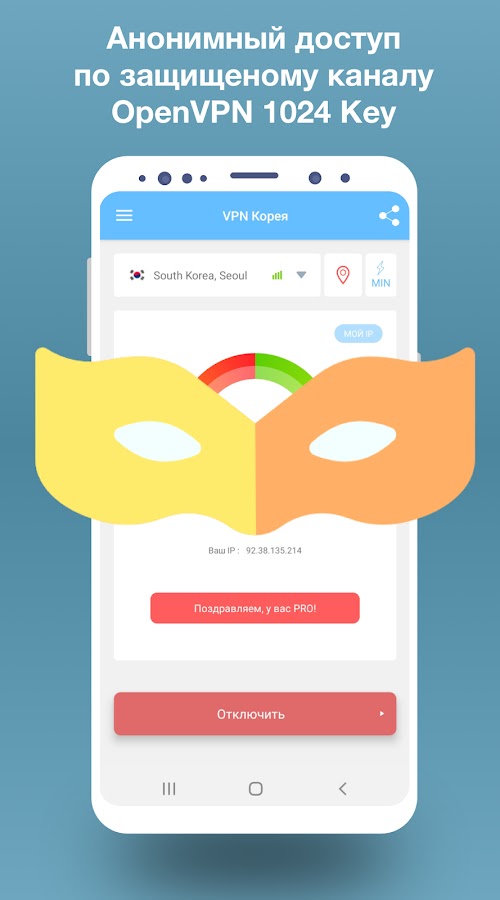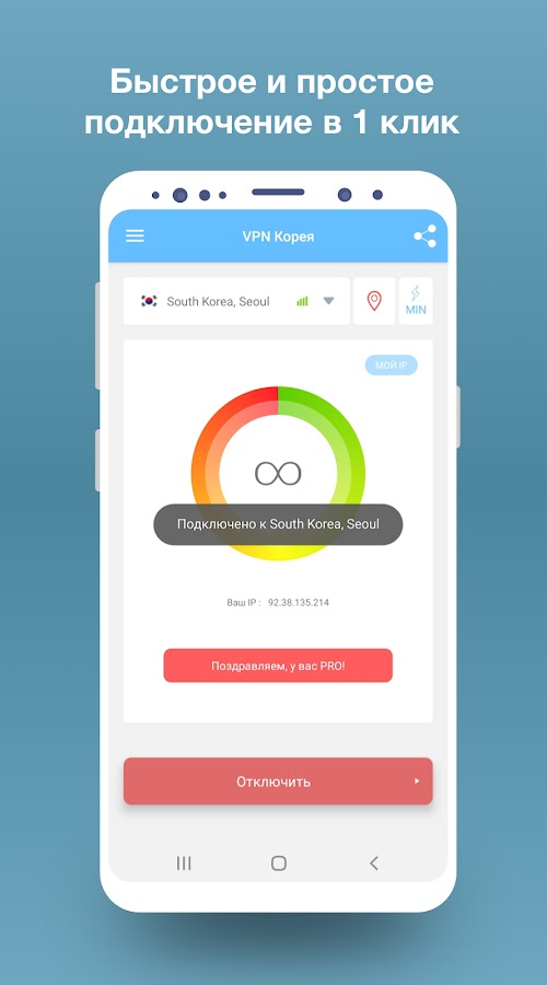 Быстрый и бесплатный Vpn Корея позволяет в один клик получить корейский IP или разблокировать доступ к закрытым сайтам и приложениям. Безопасное и анонимное подключение к открытым WIFI сетям обеспечивает технология подключения OpenVPN с OpenSSL ключом 2048 бит.