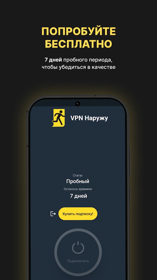 VPN Наружу предлагает 7-дневный бесплатный пробный период без необходимости ввода банковской карты.
