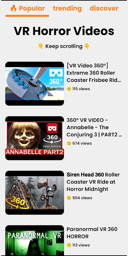 🎃🎃 Подготовьтесь к следующему Хэллоуину 2023 года. Изучите наш плейлист, чтобы испугаться с помощью приложения VR 360 видео ужасов! С лучшим выбором видео ужасов вы можете испытать ужас, как никогда раньше, это лучше, чем жуткие истории. Мы расширили нашу коллекцию 360-градусных видеороликов, включив в нее виртуальный парашют, виртуальные американские горки и виртуальные прыжки с парашютом, чтобы вы тоже могли испытать острые ощущения от приключений! Будьте готовы к паническим атакам и почувствуйте себя в фильме с лучшими видео ужасов! В этот Хэллоуин вы почувствуете ужас и панику с приложением VR Horror Videos 360. Приготовьтесь к призракам в доме с привидениями, выживанию зомби, плотоядным растениям, поедающим людей, страшным звукам, демонам, духам и многим другим страшным городским легендам. Живи своим собственным фильмом ужасов бесплатно! Наденьте очки виртуальной реальности и приготовьтесь к лучшему опыту ужасов виртуальной реальности! 🎃🎃
