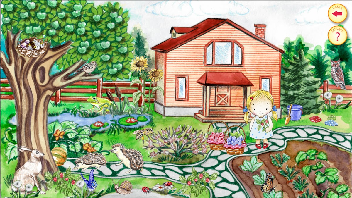 Увлекательный поиск животных и насекомых, растений и природных явлений на картинах сада по временам года. Наглядно формирует знания о сезонных изменениях в животном и растительном мире. Приложение увлекает с первых секунд, ребенок будет возвращаться к нему снова и снова. Развивает усидчивость, внимательность, наблюдательность.