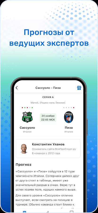 Актуальная статистика спорта, детальный разбор матчей и широкая аналитическая база делают приложение полезным как для новичков, так и для тех, кто привык подходить к спортивным событиям профессионально. Здесь собраны и ежедневные бесплатные прогнозы, и расширенные VIP-разборы для тех, кто хочет ещё глубже понимать контекст игры.