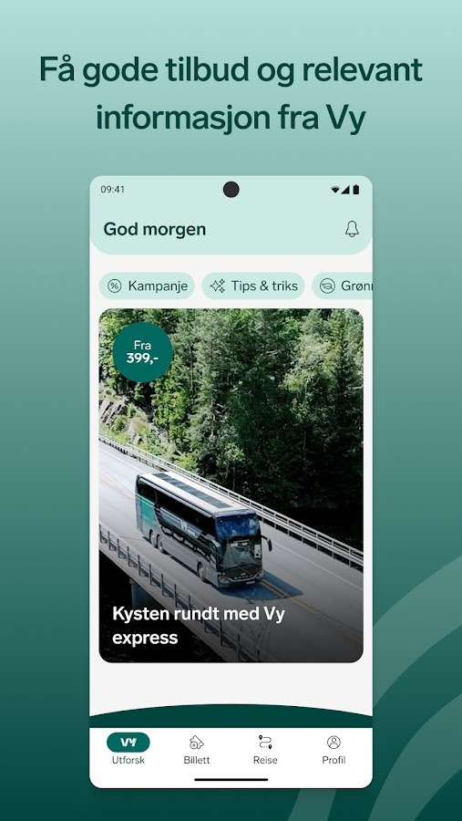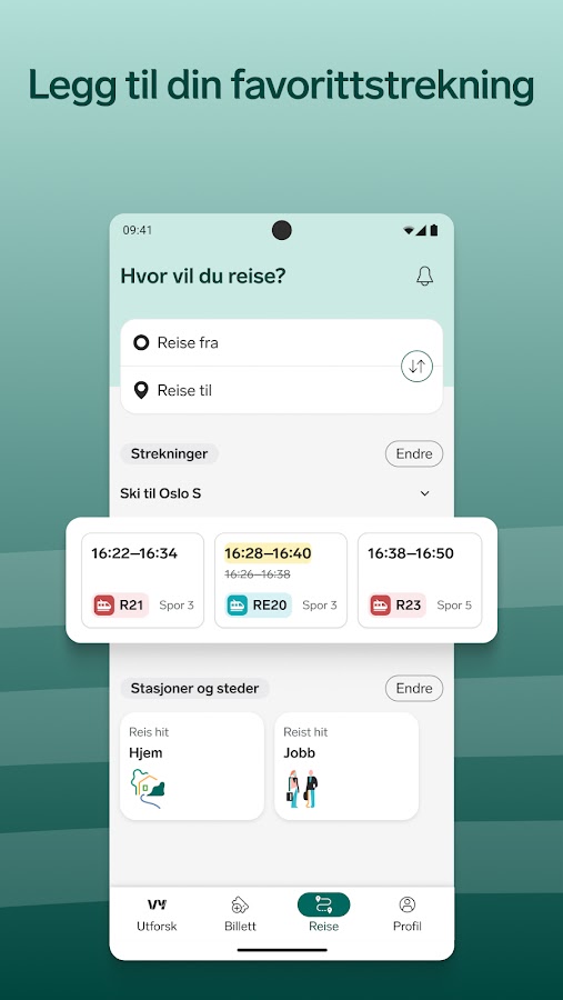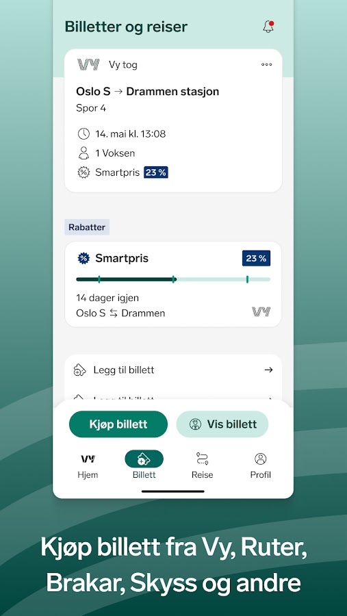 В приложении Vy вы можете легко найти отправления для поездок на поезде, автобусе, метро, трамвае и пароме по всей Норвегии. Вы можете купить билеты у Vy и других компаний, таких как Go-Ahead, SJ, Ruter, Kolumbus, Skyss и Brakar. Путешествовать экологично должно быть легко, поэтому в приложении Vy вы также можете: