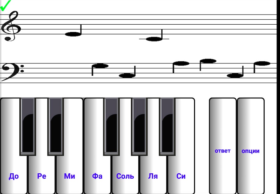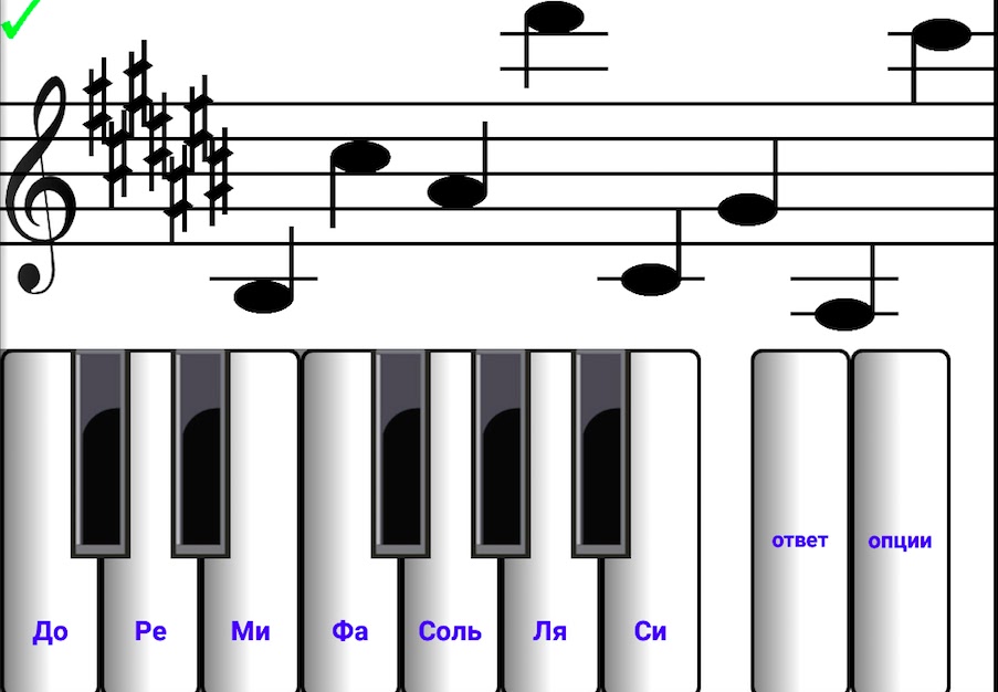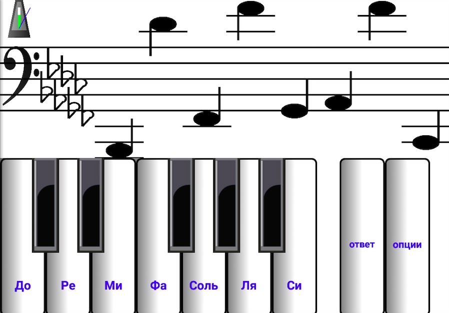 сольфеджио. Научитесь взгляд читать музыку в Скрипичный ключ и басовый ключ. Примечания выше и ниже Нотный стан. Пролет 6 октав. Применимо к любому инструменту. Примечания генерируются случайным образом, а не ограничиваться повторением набора. Переключение между ключами для еще более увлекательным. Ответ ключевым для начинающих. Обучение легче, ограничивая октавы раздел, чтобы узнать. Мажорные и минорные гаммы (диез и бемоль). Русские музыкальные ноты До Ре Ми Фа Соль Ля Си. Скорость зависит от того, насколько быстро ноты определены. Фортепианный звук можно отключить. Отлично подходит для телефонов. Идеально подходит для таблеток.