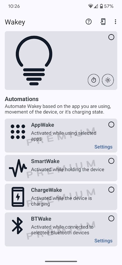 Wakey бережно относится к вашей батарее — оно будет держать экран активным, только когда это будет вам нужно. Вы можете включить его вручную с помощью большой лампочки прямо в приложении в любое время, и нажать на нее снова или использовать уведомление, чтобы выключить его. Также есть виджет, который вы можете использовать для включения или отключения.