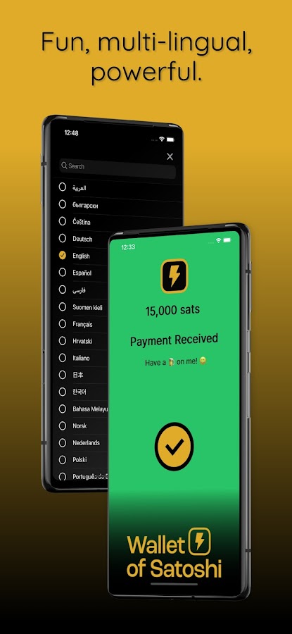 Мгновенно отправляйте, получайте и тратьте биткоины. Платите продавцам, сканируя QR-код Lightning, прикладывая NFC-карту или предоставляя свой собственный адрес Lightning. Используйте встроенную поддержку LNURL, чтобы давать чаевые, обменивать деньги или общаться с другими людьми, а также исследуйте растущую экосистему игр, приложений и сервисов, основанных на Lightning.