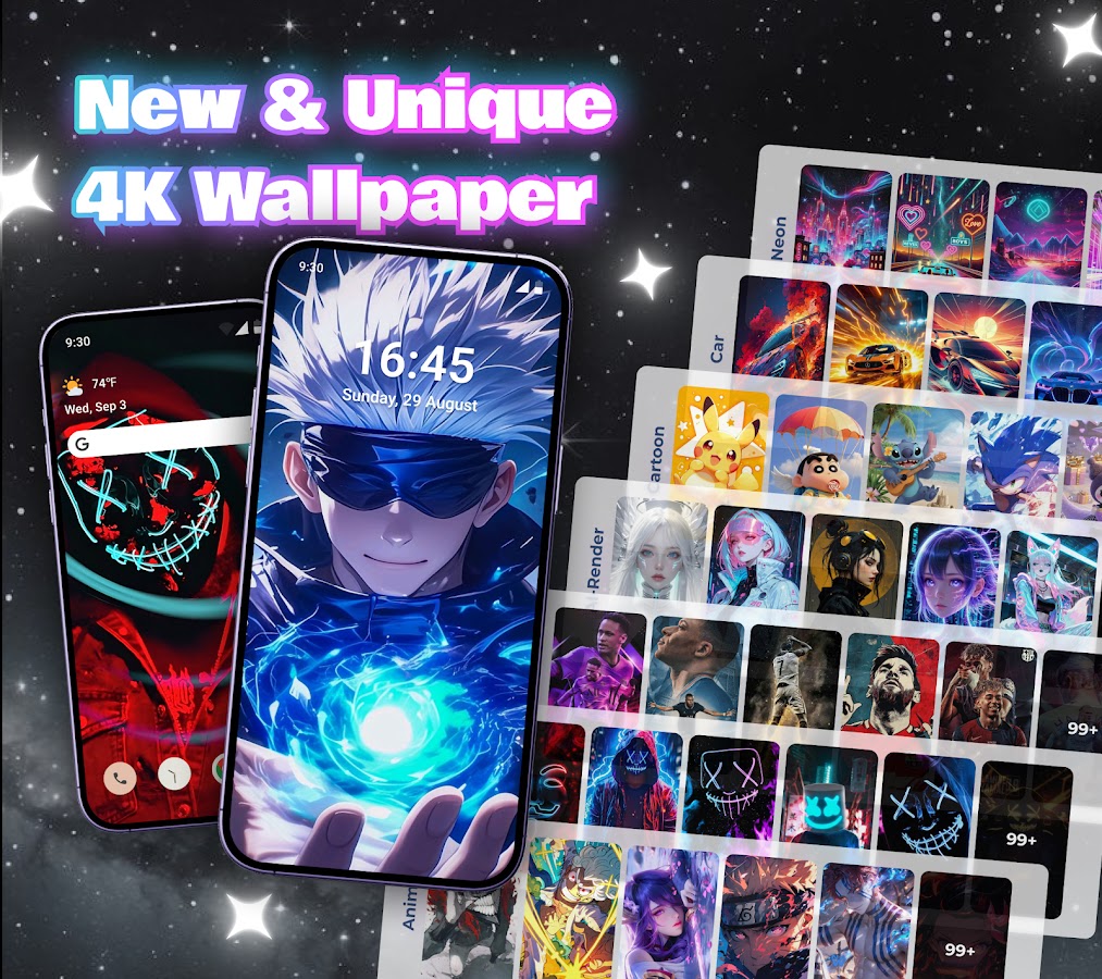 Содержит множество изображений в более чем 22 уникальных категориях: аниме, автомобили, мультфильмы, круто, любовь, природа, искусство, животные, неон, галактика, спорт…. Wallpaper 4k предоставляет обои по вкусу, настроению и стилю.