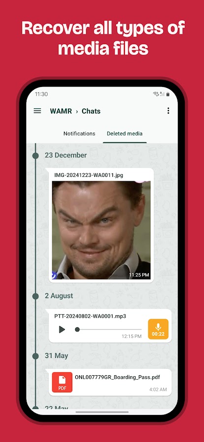 WAMR helps you recover deleted text messages and media attachments (photos, videos, voice notes, audio, GIFs, and stickers) from your chat apps. Stop wondering what was said and regain control of your conversations!